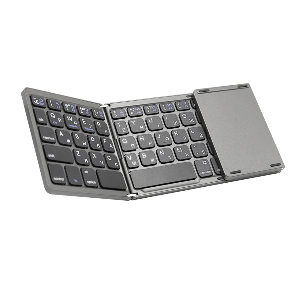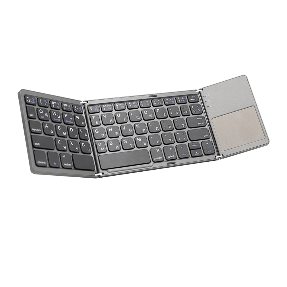 Портативная раскладная клавиатура Flexibord отличный помощник в путешествии, походе или кафе — в любом месте где можно удобно устроится с планшетом или телефоном для виртуального серфинга или общения в чате. Имеется удобный touchpad c отличной реакцией отклика. Встроенный аккумулятор, обеспечивающий продолжительность работы в 3-4 часа. И что самое приятное, раскладка клавиатуры дублируется русским алфавитом.